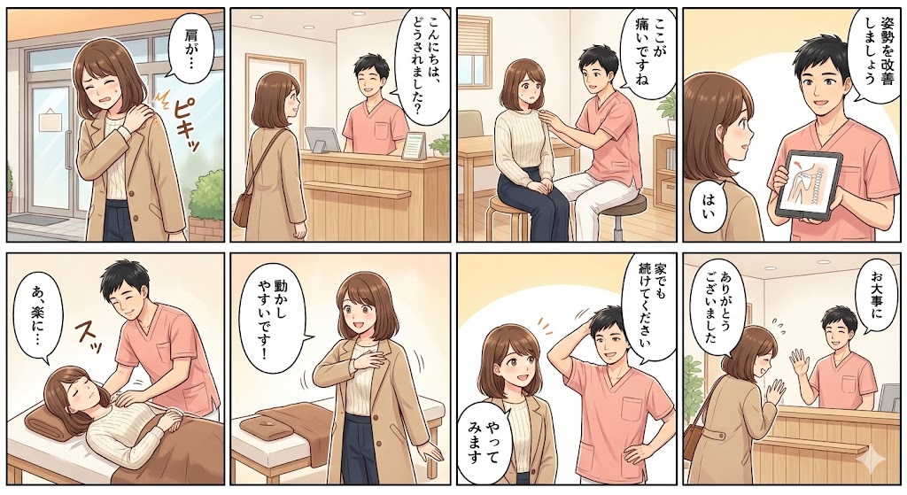 そのため、肩だけを揉んでも一時的に楽になるだけで、原因が残っていると再発しやすくなります。